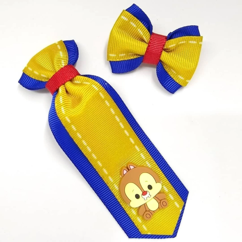 Alique emborrachado em formato de esquilo no centro do laço e na ponta da gravata.