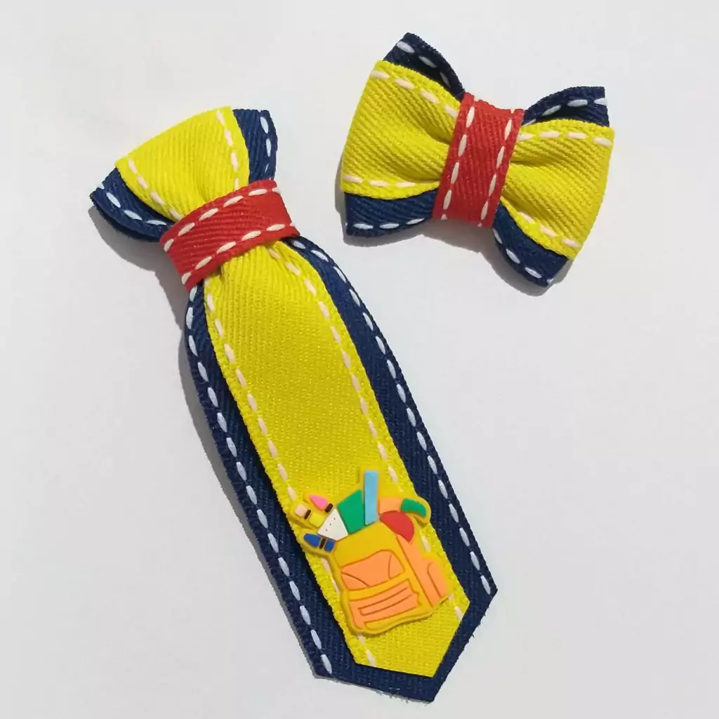 Fita azul com pesponto branco sobreposta por fita amarela com pesponto branco.