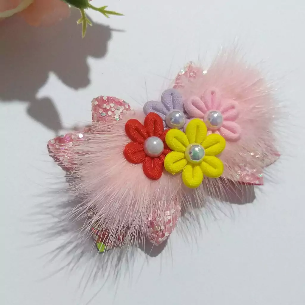 Aplique em formato de buquê de flores e pompom de pêlo rosa no centro do laço.