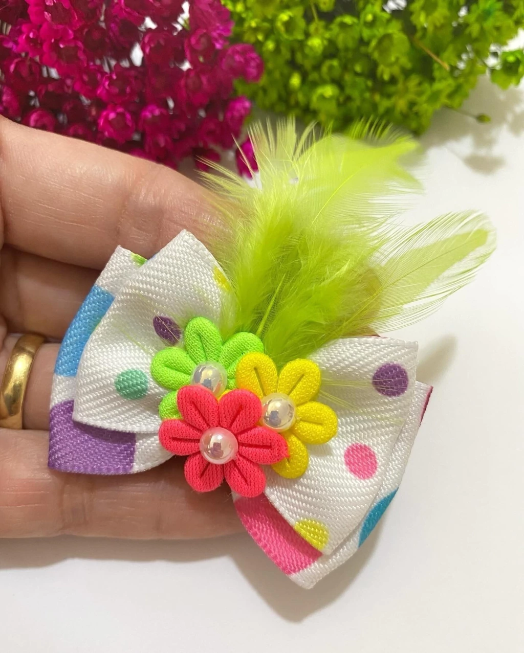 - Laço em fita com Poá colorido.