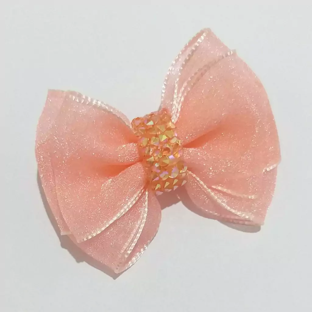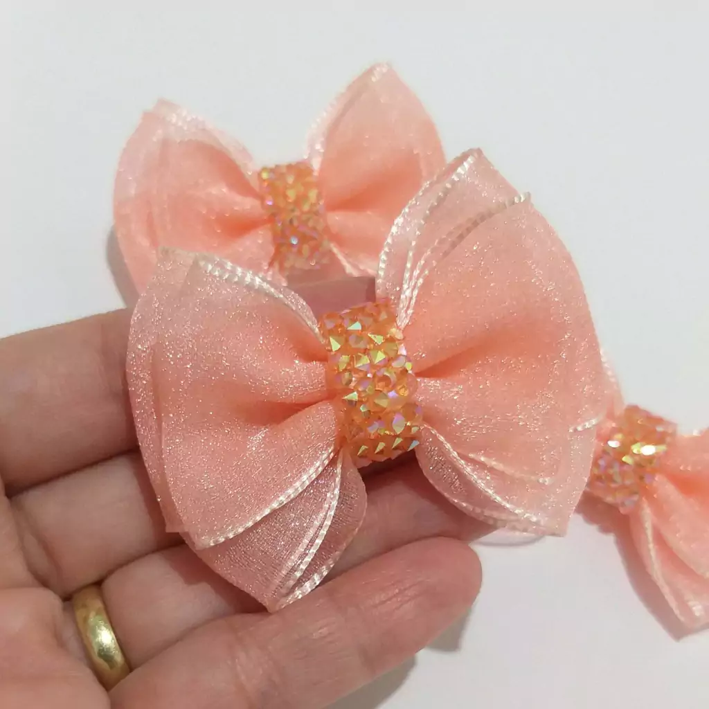 Aplique tira com pedraria rosa salmão no centro dos laços.