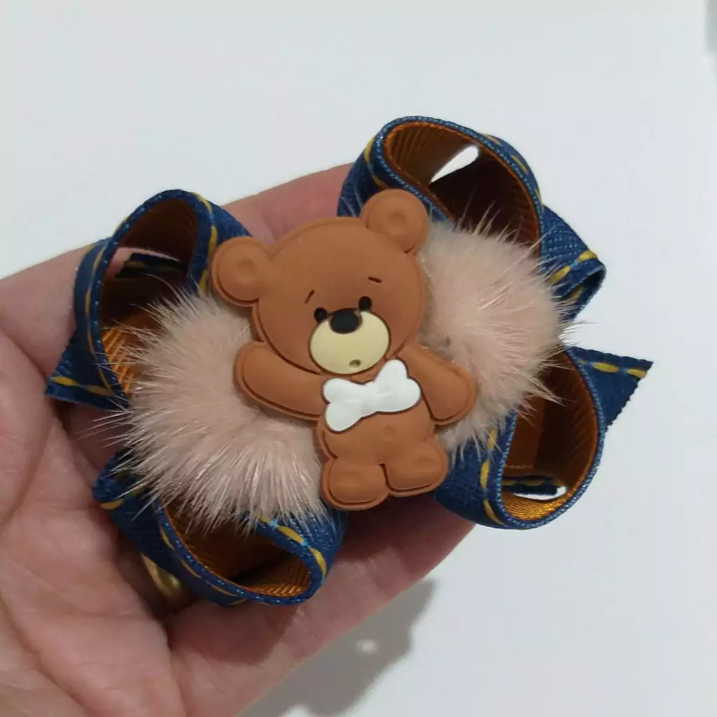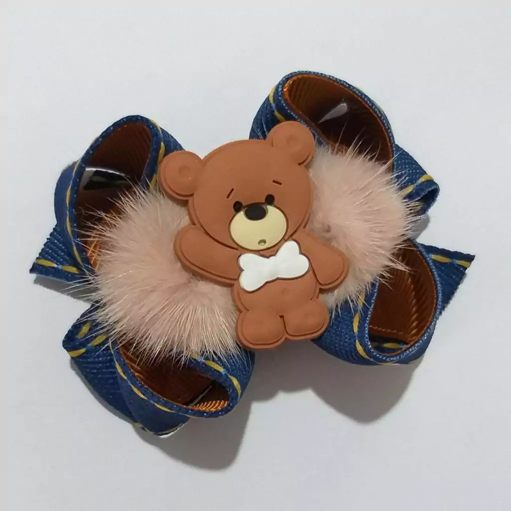 Laço G em unidade confeccionado em fita jeans azul e gorgurão marrom.