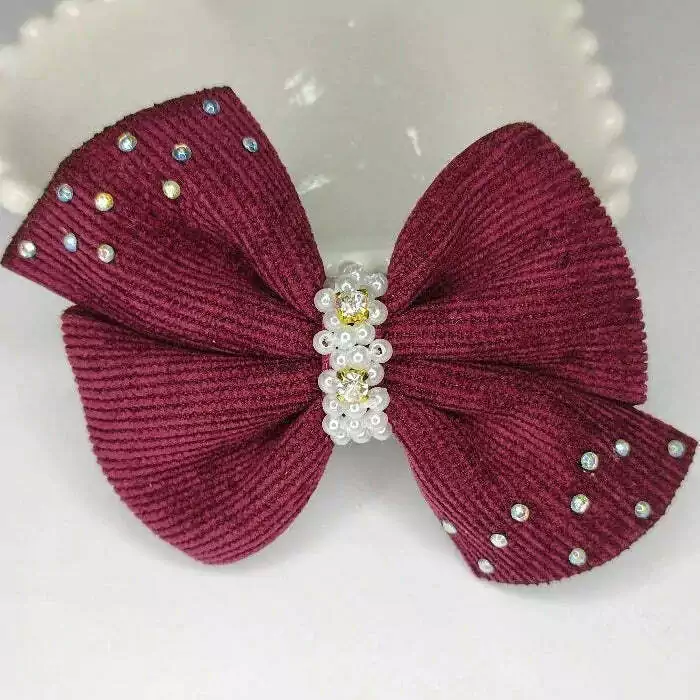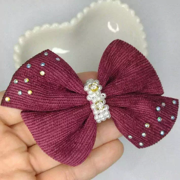 Bordado em pérola e Strass no centro do laço e apliques de brilhos nas pontas do laço.