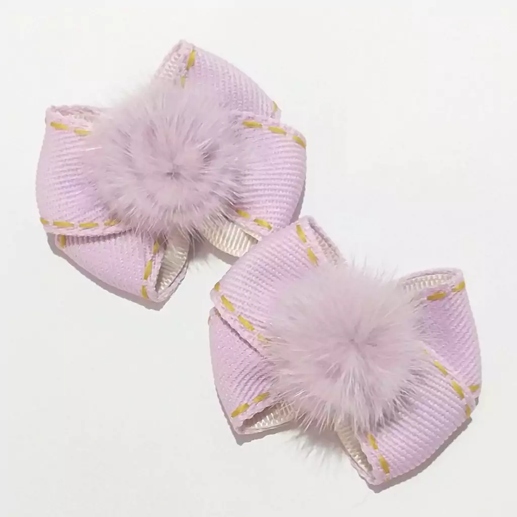 Aplique de pompom peludo no centro dos laços.