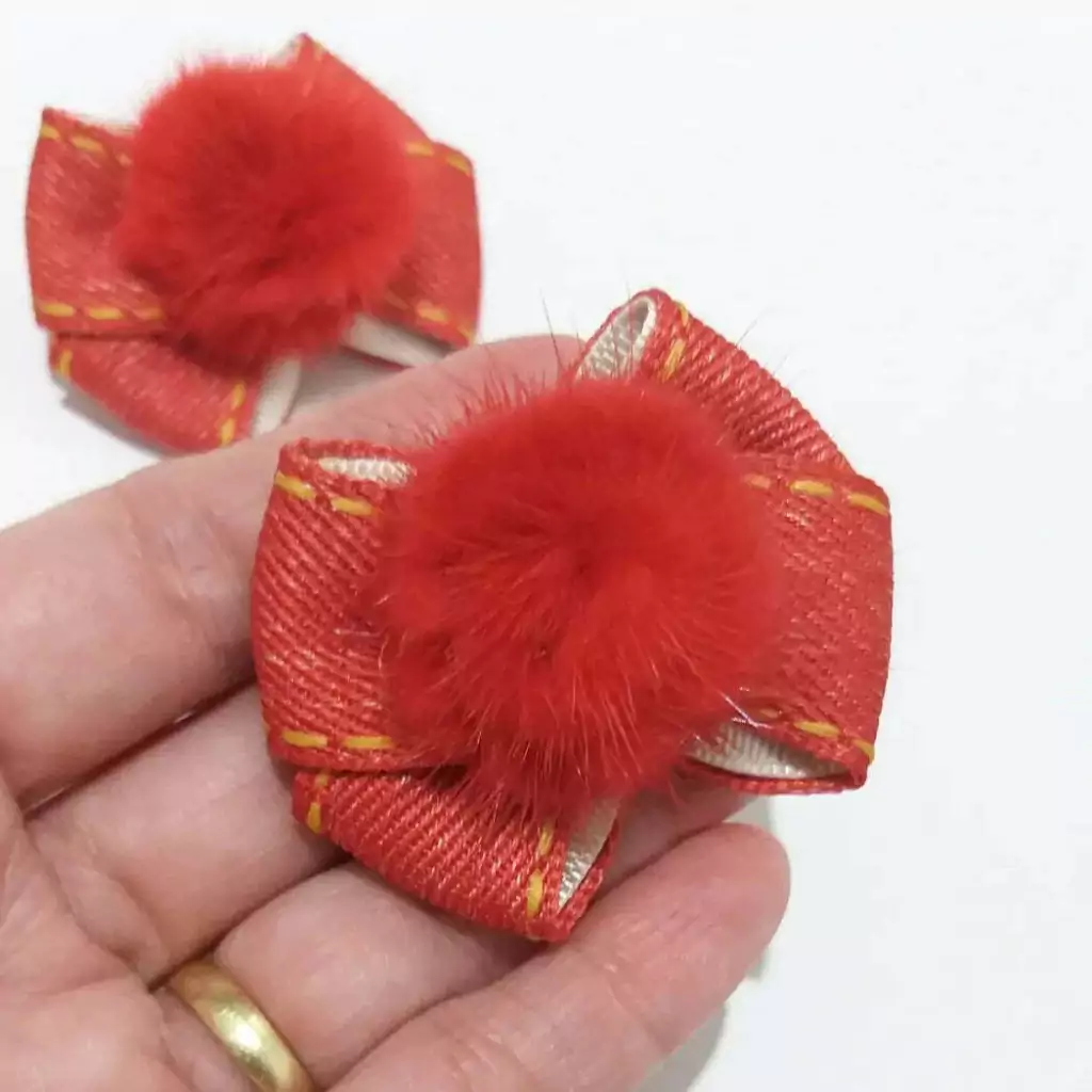 Par de laços em fita jeans vermelho. Modelo cruzado.