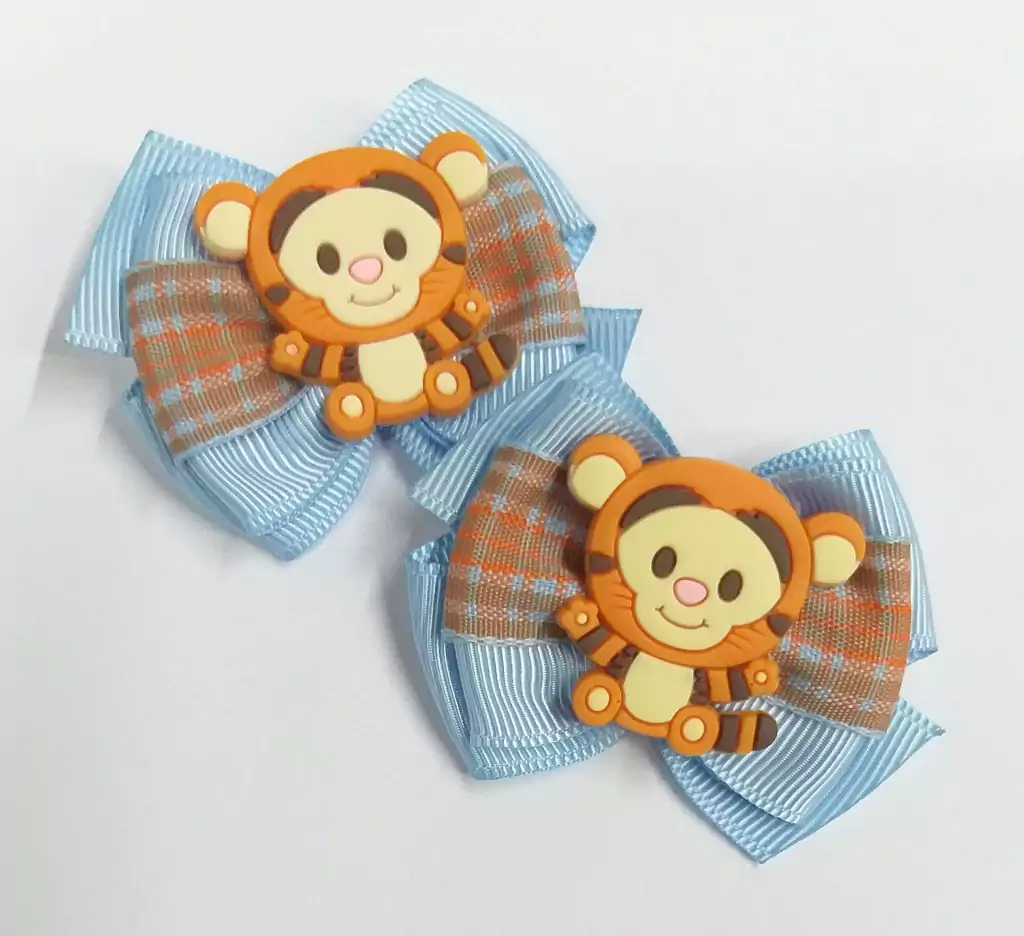 Par de laço em fita azul claro com sobreposição de fita xadrez em cores azul e laranja.