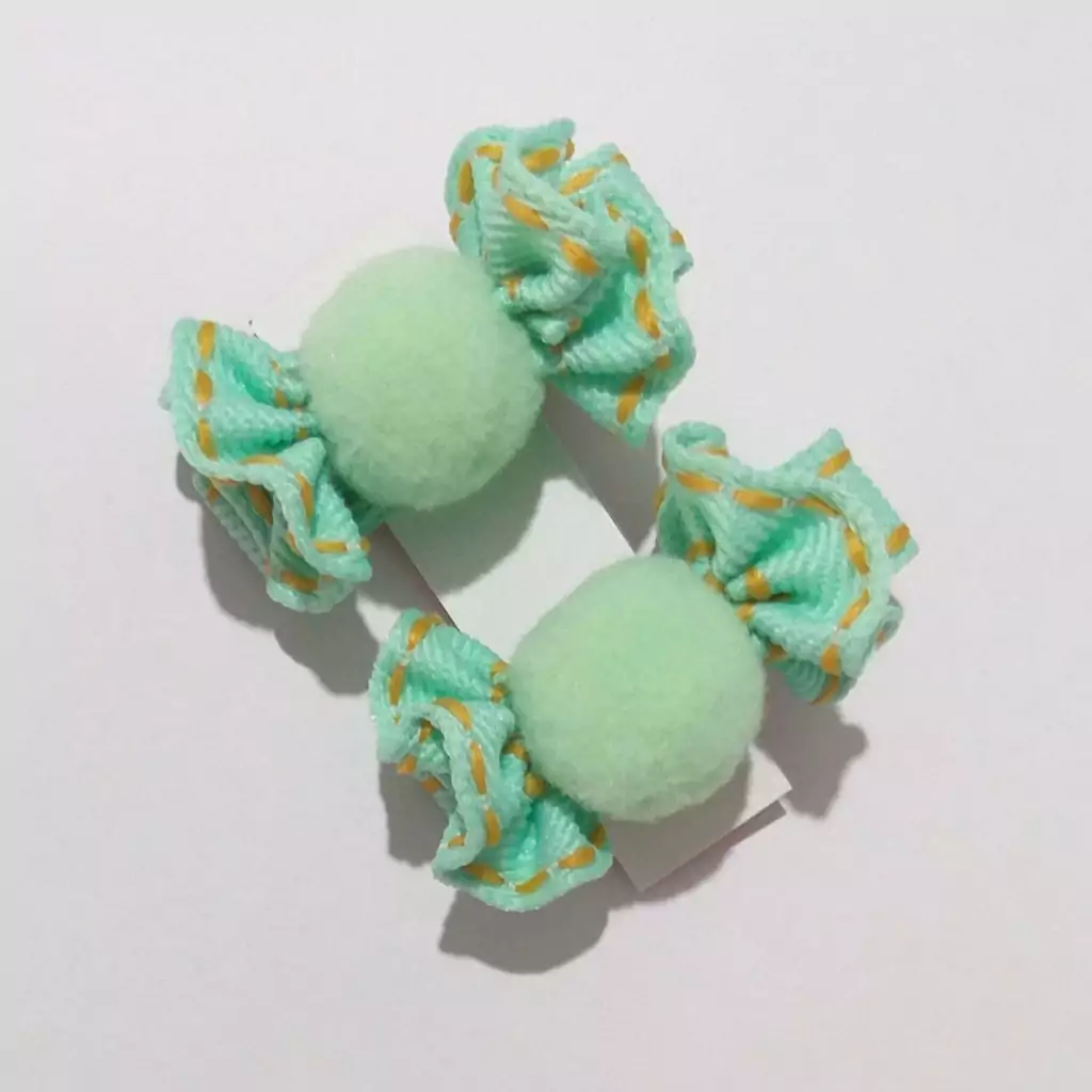 Par de laços formato de balinha em fita jeans verde e pompom verde, no bico de pato.