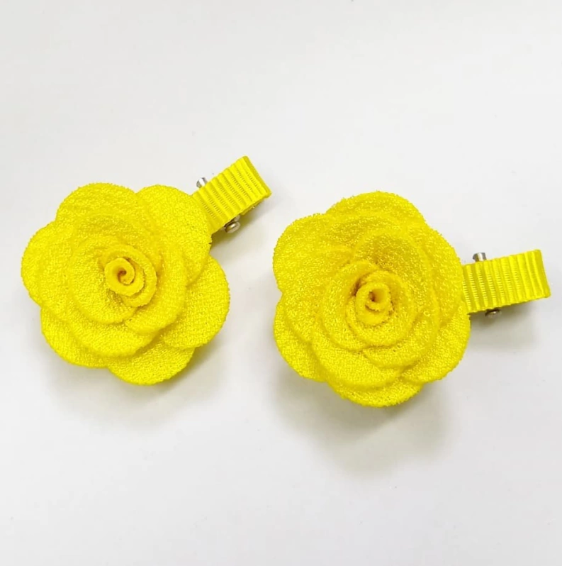 Par de clips (bico de pato) revestidos com fita de gorgorão amarela e aplique de flor amarela.