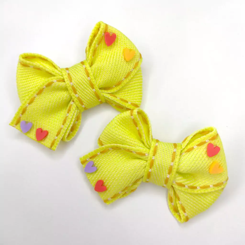 Par de laços em fita jeans amarelo. Modelo cruzado.