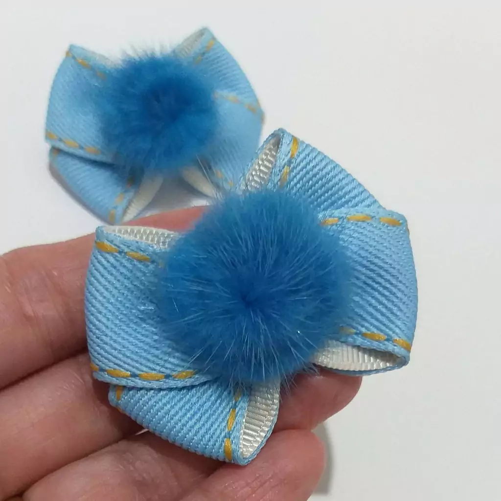Par de laços em fita jeans azul claro. Modelo cruzado.