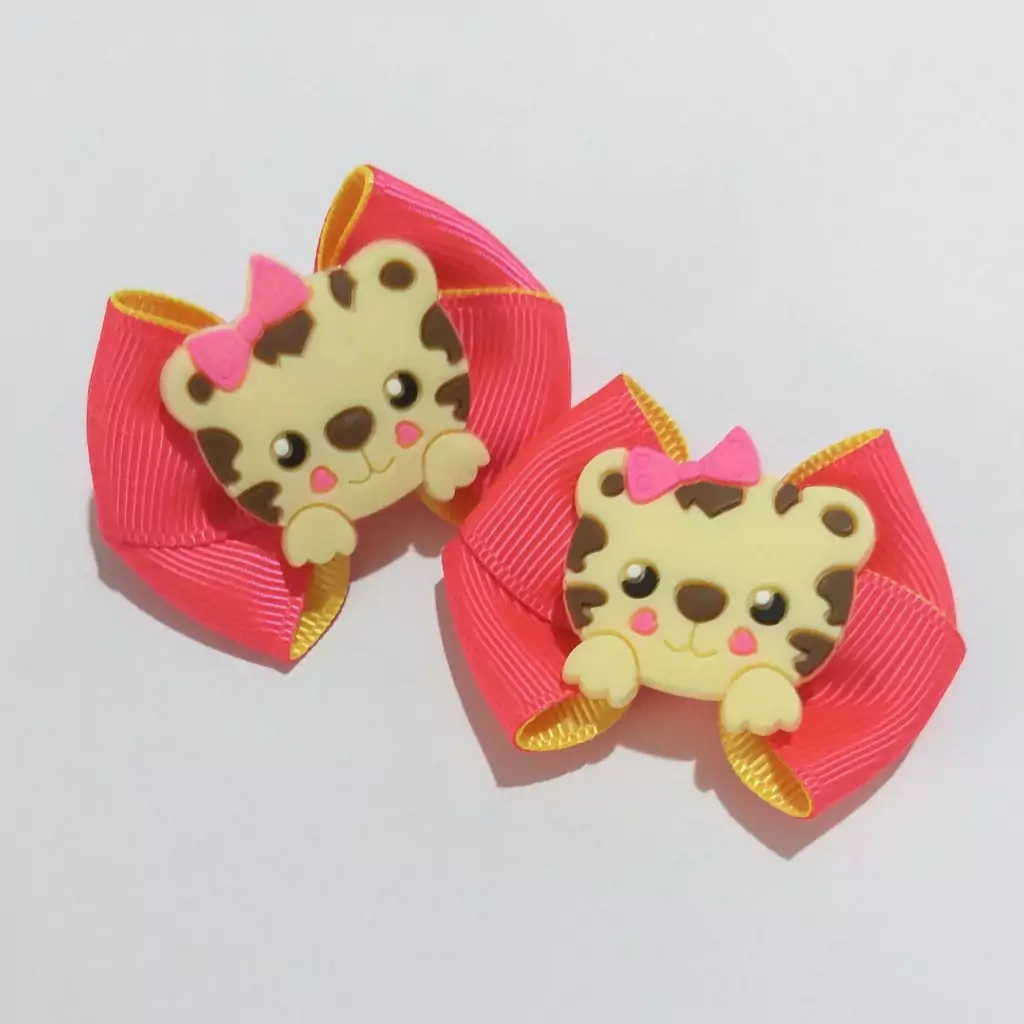 Par de laços em fitas rosa e amarelo claro sobrepostas.