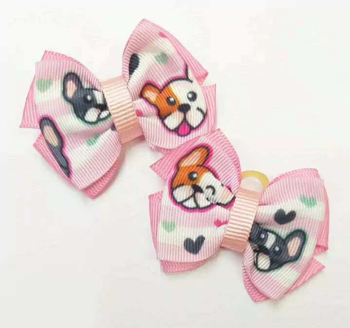 Par de laços em fita de gorgurão com estampa de dogs com fundo rosa.